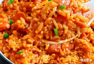 第2款是比较家常的番茄火腿鸡蛋盖饭。先准备好火腿和番茄,先把火腿肠切片、番茄切块备用,再打两个鸡蛋,搅散放一旁备用。锅内热油先炒香蒜末,然后加入番茄块炒软,用中火慢慢炒,直到炒出汤汁,这时候来调一个番茄盖饭的灵魂酱汁:两勺番茄酱、一勺蚝油和两勺生抽,这个做法没有难度,非常家常。将酱汁和番茄搅拌均匀后再加入切好的火腿继续翻炒,翻炒一分钟左右后接着再加半碗清水,然后盖上锅盖煮沸。等锅开后倒入刚刚搅散的鸡蛋液,这里要注意一下,倒进去之后不要立即翻动,等鸡蛋液在锅中慢慢成型后,加入半碗水淀粉再搅拌均匀。最后撒点葱花或香菜,然后把番茄火腿鸡蛋盖在米饭上就可以啦。