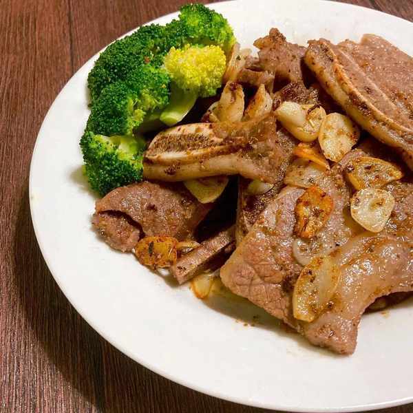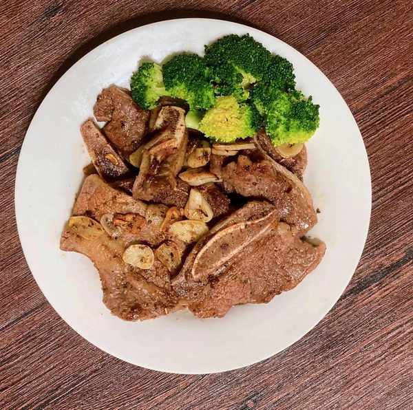 1. 牛小排退冰解冻后擦拭血水,双面涂抹盐巴、黑胡椒。蒜头切片备用。花椰菜入滚水烫3分钟左右,起锅备用。