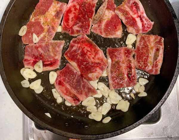 2. 热锅下油,中火放入蒜片炒香,放入牛小排煎1分钟至单面焦香