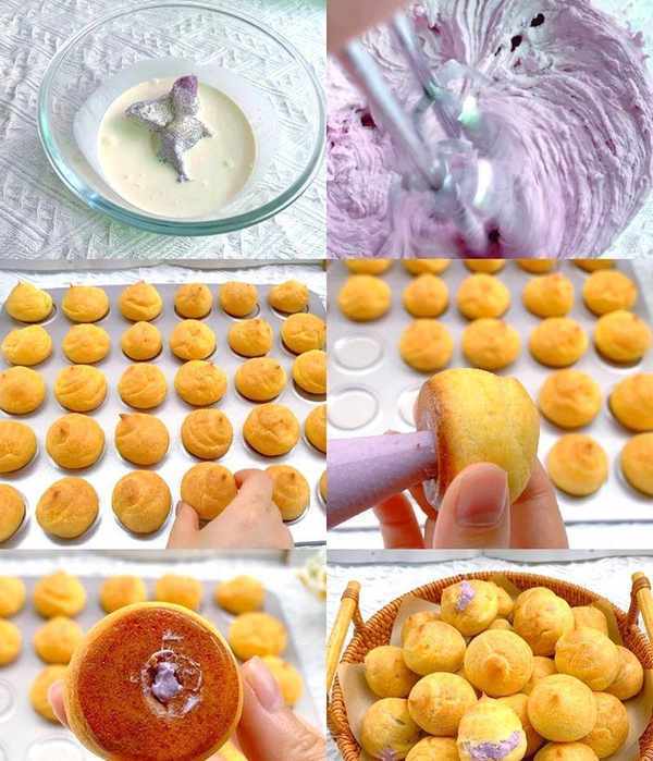 4.加入芋泥打至顺滑,装入裱花袋。烤好的泡芙底部开一个小口,挤入芋泥奶油馅。