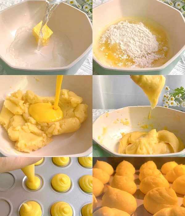 1、黄油、白糖、水一起放入锅中煮沸,加入低粉,关火搅拌均匀。