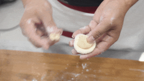 在小面块上,放入适量的豆沙馅,边向下摁豆沙,边收紧开口,把多余的面揪掉,做成圆面坯备用,用刀把圆面坯压成薄厚均匀的圆形面片,不能用面杖擀 ~