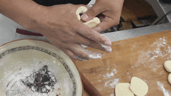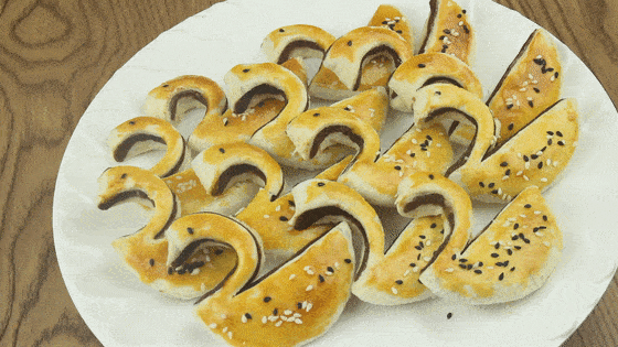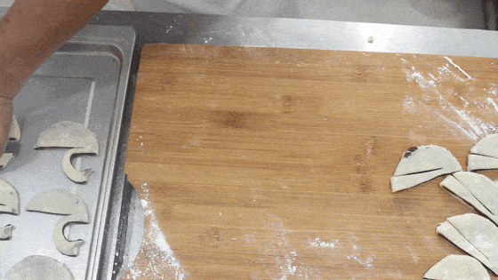 然后把圆面片从中间切开,离切口一厘米处,切开一条缝,不要切断,在烤盘上均匀刷上油,捏住切口处旋转90度,天鹅的造型就做好了,把做好的天鹅酥生坯摆放在烤盘中备用~