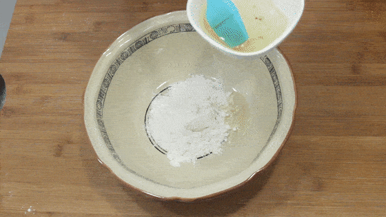 我们准备面粉50克,加入植物油5克,炼乳5克,也可以用奶酪代替,增加香味,白糖3克,用凉开水和面,和成柔软的光滑面团 备用~