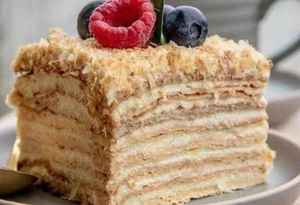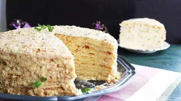 这种名为 Наполеон的点心最早出现在19世纪,扬名于1912年俄国庆祝战胜法国的100年庆典。其 千层的结构取义自拿破仑率领的大军团(Grande Armée),而蛋糕面上撒的白色粉末,则象征帮助俄军打了胜仗的那场漫天大雪。