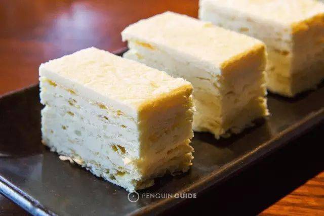 这是一种乳白色的软糕,又被筛了层薄薄的细粉,看起来和传统的拿破仑酥有些相似,但口感却不太一样, 是充斥着黄油奶香的酥软,而非酥脆。