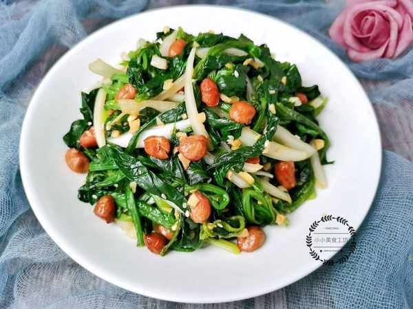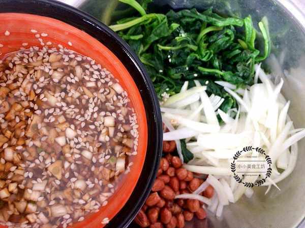 1、准备食材。将菠菜择去黄叶和根部后,用清水冲洗干净,然后放入热水中焯烫变软,水中可适量加些食盐和食用油帮助菠菜维持碧绿的颜色。准备洋葱,剥皮洗净后切丝备用。准备花生米,洗净后粮油下锅,小火翻炒成熟后晾凉备用。