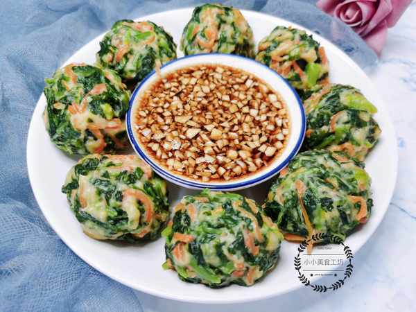 4、用热油爆香蒜末后,再加入适量生抽,香醋来调制成蘸水,搭配菠菜菜团吃非常可口。