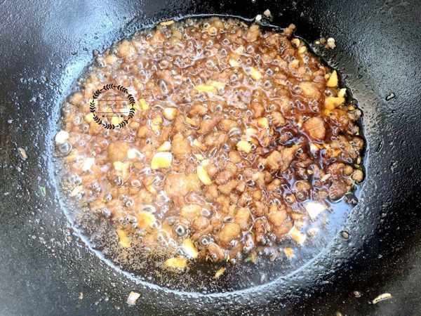 2、炒制肉末。将猪肉洗净剁成肉末,放入油锅中翻炒变色后加入蒜末继续翻炒,炒香后加入适量生抽,老抽,蚝油和食盐调味,全程中小火不断翻炒,直至将肉末中的水分炒干。
