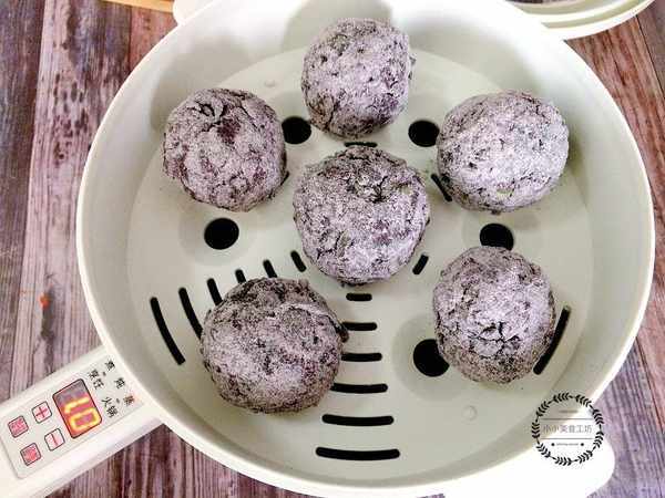3、用手揪一块菠菜面团,用手团成丸子状,然后再裹一层黑麦粉防粘,将做好的菠菜包放入蒸屉中,大火蒸制15分钟即可。