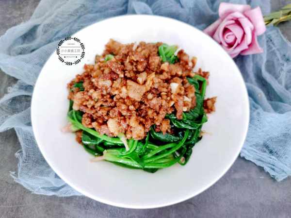 3、将焯烫好的菠菜摆放在盘子底部,然后淋入炒香的肉末即可。