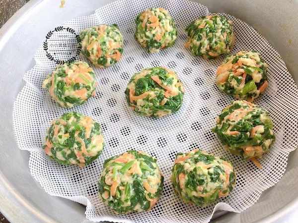 3、将混合均匀的菠菜菜团用手整理成小馒头状,然后放入蒸屉中蒸制20分钟即可食用。