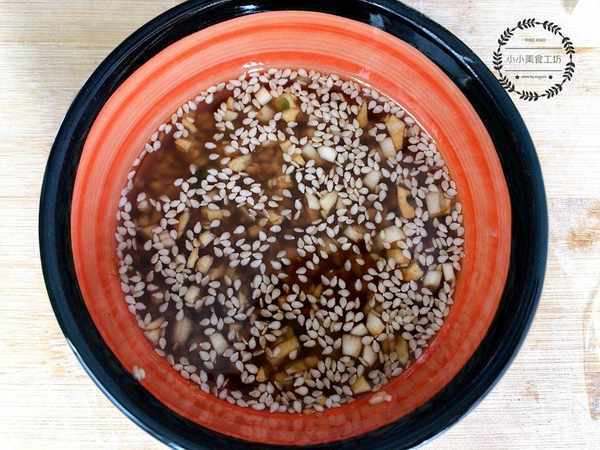 2、准备凉拌汁。将大蒜剥皮洗净后切成蒜末放入碗中,加入适量的芝麻,食盐,香醋和生抽,然后淋入热油爆香蒜末,拌匀后备用。