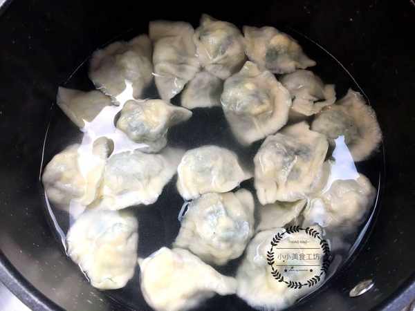 3、煮饺子。锅中倒入适量清水,大火煮开后下入饺子,直到饺子煮制全部浮起即可盛盘。