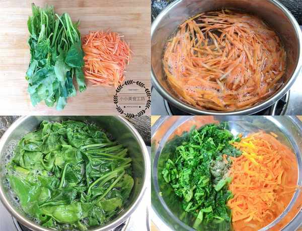 1、准备食材。将菠菜去根后洗净,胡萝卜去皮后切丝,将两者分别放入开水中焯烫变软后捞出。沥干十分后随意切两刀,再加入适量五香粉和食盐调味。