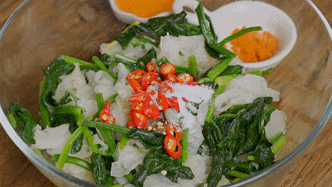 3.银耳和菠菜焯水后挤去多余的水分,放入大碗中,拌匀加入生抽、蚝油、陈醋、糖、辣椒粉、熟白芝麻、小米椒圈、辣椒油、香油拌匀即可