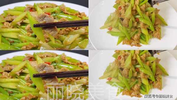 7、炒到入味的时候,接着再放入焯水的芹菜,然后再继续给炒一炒,炒到入味的时候 再放入盐 鸡精 蚝油 生抽 老抽 接着再继续炒一炒,炒入味 再给盛出 美味好吃的芹菜炒肉就做好了。