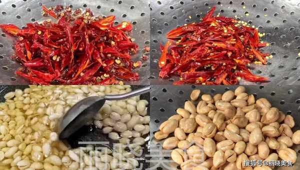 8、锅中烧油 放入辣椒丝 花椒给炒一炒,小火慢炒。炒入味 再放入花生米继续给炒一炒,小火慢炒 接着再放入盐 鸡精 白酒 再继续给炒一炒,炒入味 给盛出 美味好吃的酒鬼花生就做好了。