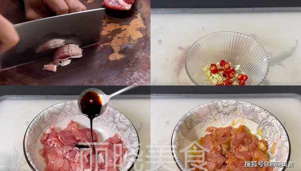 4、准备一些猪肉 先给猪肉清洗一下,可以先把猪肉小一点的肉块,然后再给切成薄一点的肉片,猪肉我这里准备一些二分肥八分瘦猪肉 接下来再给猪肉片腌制一下,添加盐 鸡精 蚝油 生抽 老抽 胡椒粉 再给充分的搅拌均匀 接着再给放在一边备用
