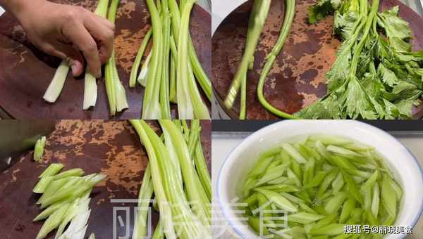 2、芹菜控干水分,接着再给芹菜切一下,接着再给芹菜切成细一点的芹菜条,接着再给芹菜切成长短均匀的芹菜段,把切好的芹菜段给放进盆中备用