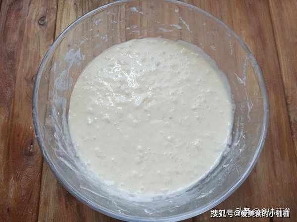 5、一直搅到像这种稀的面糊,用筷子挑起来往下流,类似于家中的老酸奶一样,就可以了,盖保鲜膜醒发至2倍大,大约40分钟,满满一大盘。