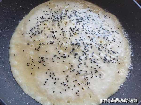 6、搅拌一下,让面团排排气, 平底锅预热1分钟,刷上一层食用油,等待锅热以后,开小火即可,倒入面糊,用工具摊成薄厚均匀的一层,撒上黑芝麻。