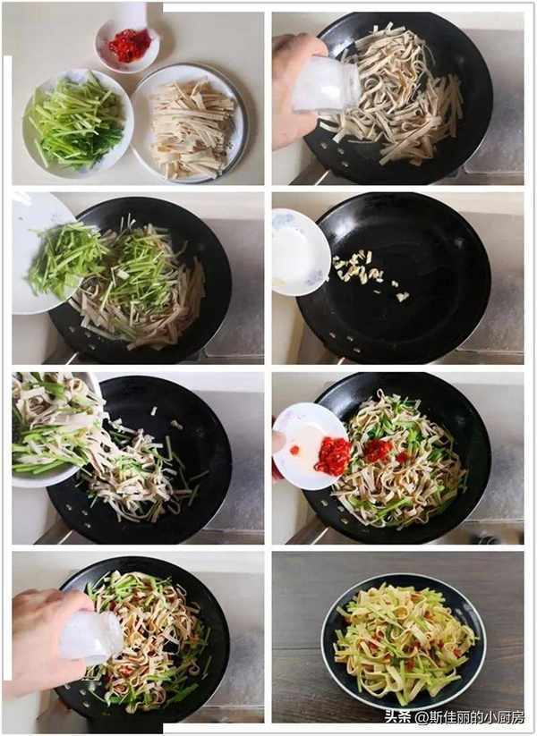 制作:1. 准备好食材; 2. 烧锅水加入少许盐,将千张丝放入锅中煮2分钟; 3. 将洗净的芹菜丝放进锅中焯煮变色后捞出备用; 4. 热锅凉油,加入少许蒜末进锅爆香; 5. 加入千张丝和芹菜进锅翻炒两下; 6. 加入1勺剁椒进锅翻炒几下; 7. 加入适量的盐调味; 8. 翻炒均匀即可。
