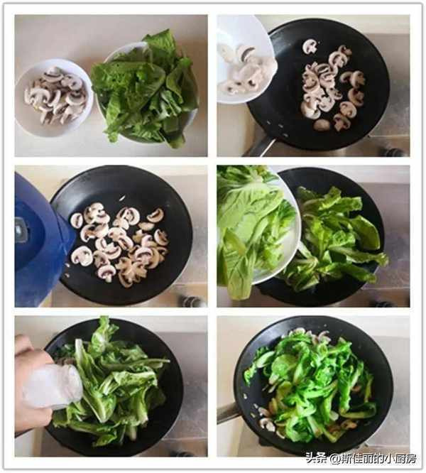 制作:1. 准备好食材; 2. 热锅凉油,加入口蘑片进锅翻炒; 3. 加入少许水,不停地将口蘑炒至八成熟; 4. 加入洗净的毛白菜进锅翻炒至微微变色; 5. 加入少许盐调味; 6. 翻炒均匀即可。
