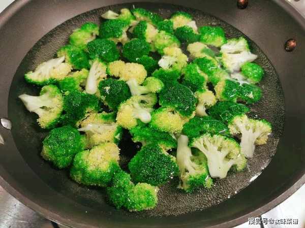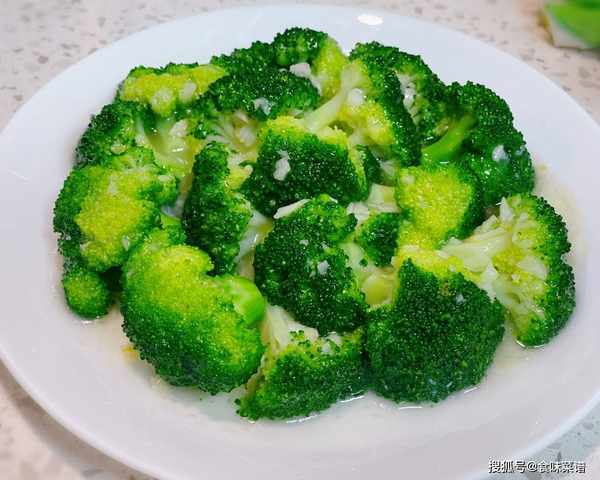 1、准备一朵新鲜的西兰花,摘洗干净,切成小朵,起锅烧水,水开加少许的食盐和植物油,这样保持西兰花原有的翠绿,放入西兰花,焯烫一会儿,捞出过凉控干水分。