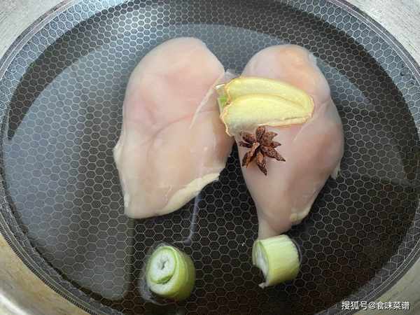 1、鸡胸肉是鸡身上最大的两块肉,肉质细嫩,滋味鲜美,营养滋补,低脂低热量,适合多种吃法,准备两块鸡胸肉,清洗干净,凉水下锅,放入葱姜和八角,大火煮沸转小火,煮熟后捞出,控干水分。