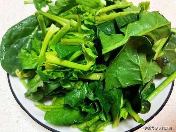 1、准备一把鲜嫩的菠菜叶,越鲜越好,摘洗干净,起锅烧水,加入少许的食盐和植物油,放入菠菜叶,焯烫一下,捞出控干水分,菠菜有草酸,烫一烫更健康。