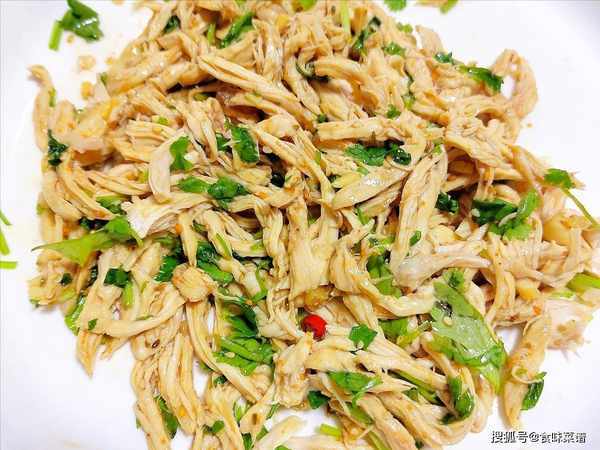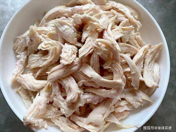 2、等稍微晾一会儿,把煮好的鸡胸肉,手撕成细丝,煮鸡胸肉的时间,一般控制在10-12分钟左右,基本都能煮熟。