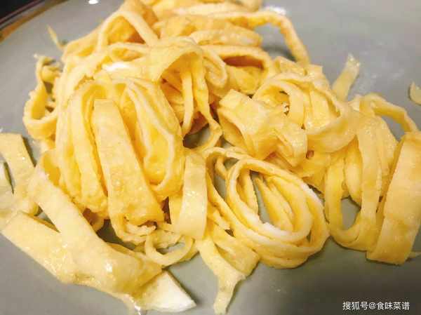 2、碗中打入2个鸡蛋,起锅烧油,油热倒入鸡蛋液,轻轻转动锅底,把鸡蛋液铺平,用中小火慢慢加热,等蛋液凝结熟透后起锅,改刀切成细丝。