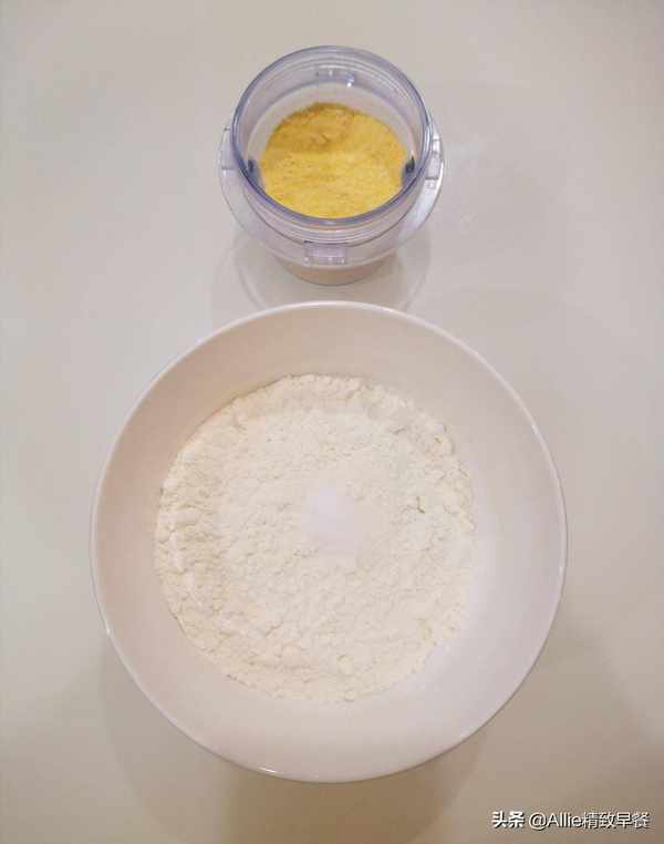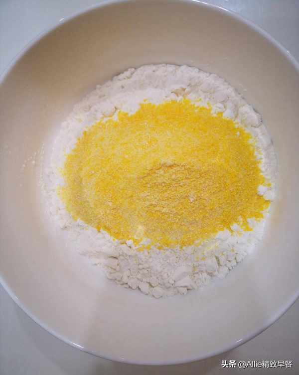 将玉米粉倒入面粉中,玉米粉与面粉的比例为1:5,粗细结合,营养丰富,饱腹感强。