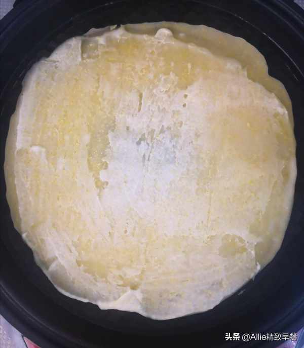 面团不要太厚,如果面团太厚,摊的时候不容易把蛋糕刮平,蛋糕会更厚。图中可以看到,可以快速滑动,没有痕迹,稠度也刚刚好,醒了30分钟,醒后做出来的蛋糕更紧实,更柔软。