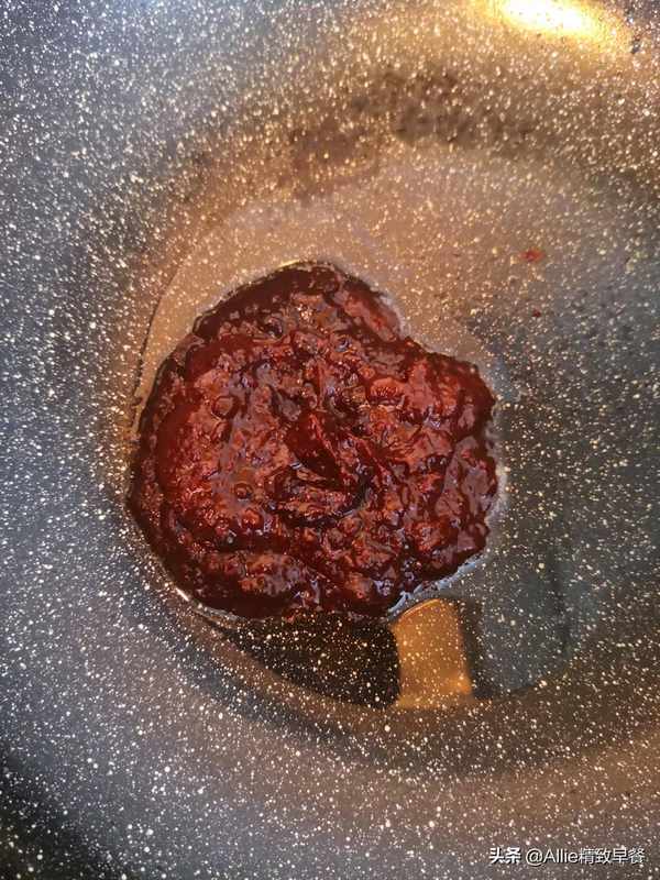 锅中加入适量油,油热后倒入豆瓣酱炒香。
