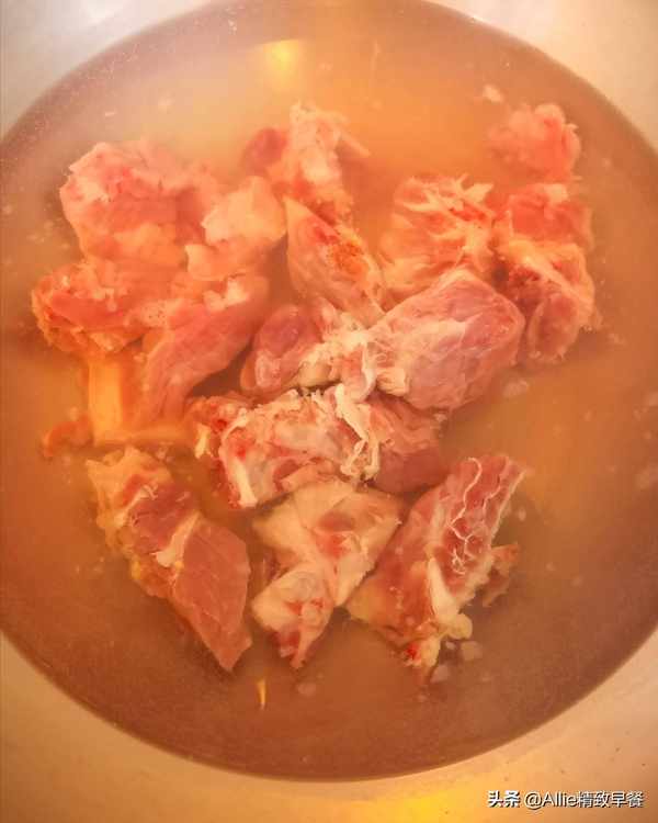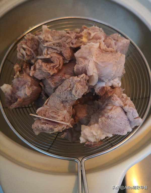 排骨洗净后,放入冷水锅中,用旺火烧开,捞出控水。