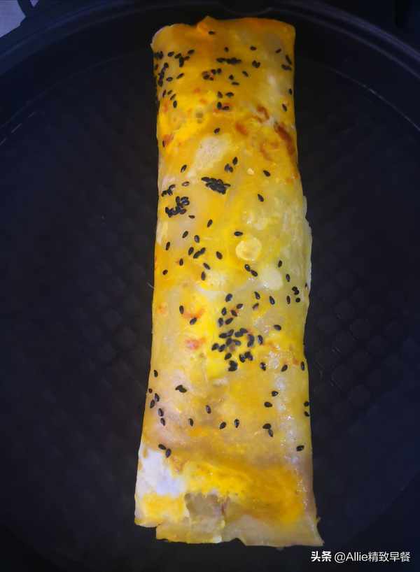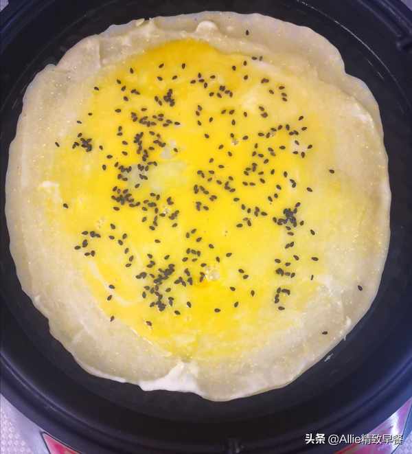 打一个鸡蛋,撒上黑芝麻,等蛋液和面团凝固大半后,用铲子轻轻翻动,翻得太早容易把面团弄破。