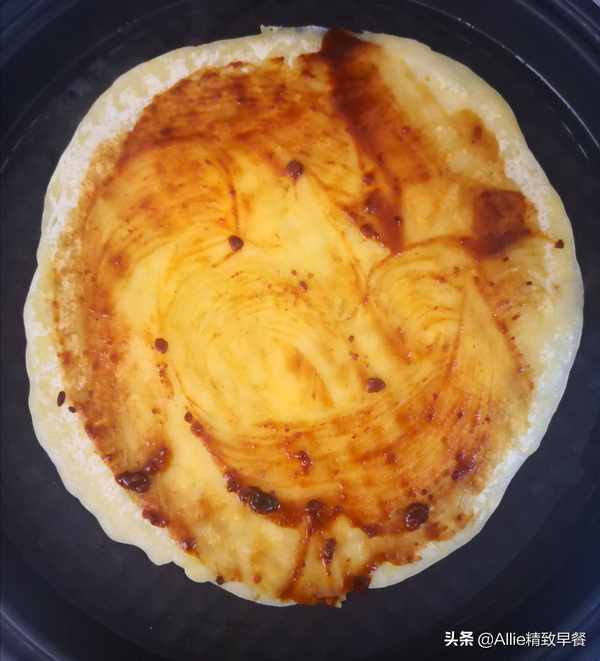 再来一个,这次在煎饼上刷一点油,电饼铛刷一点油,其他方法同上。有油和无油烤的区别是烤出来的饼皮更油,所以更容易翻面。