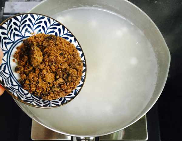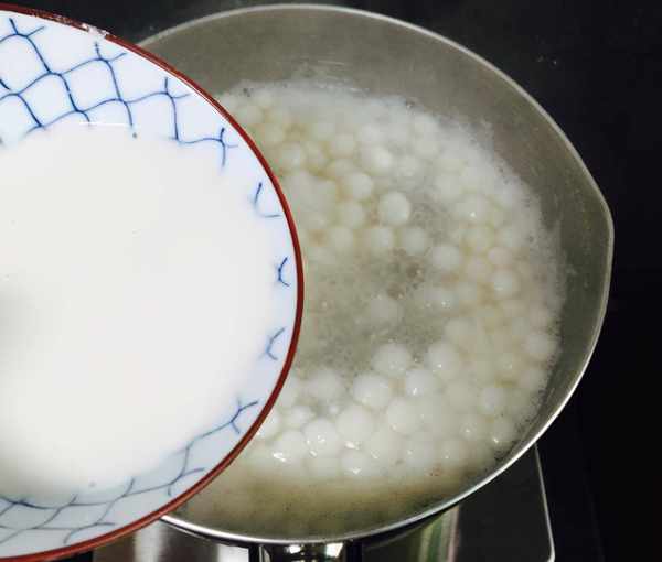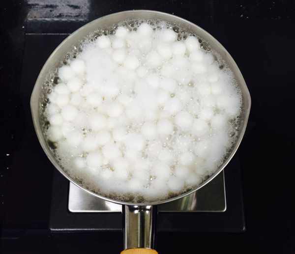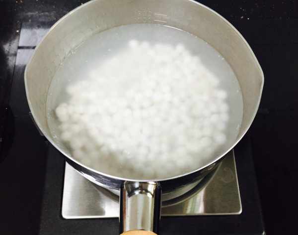 6、开大火将水煮沸之后,加入小圆子,转为小火慢煮。