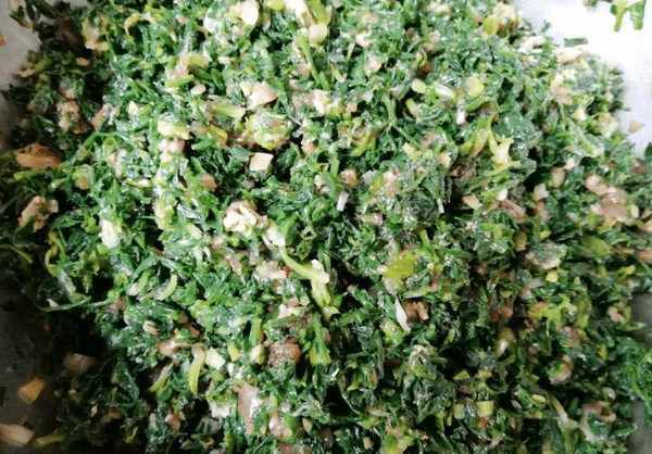 2、荠菜放凉后,用手挤去水分,剁碎,放入肉馅中,加入适量的盐、生抽、蚝油、鸡精、香油,打入一个鸡蛋,用筷子搅拌5分钟,肉馅勾芡后腌半小时。