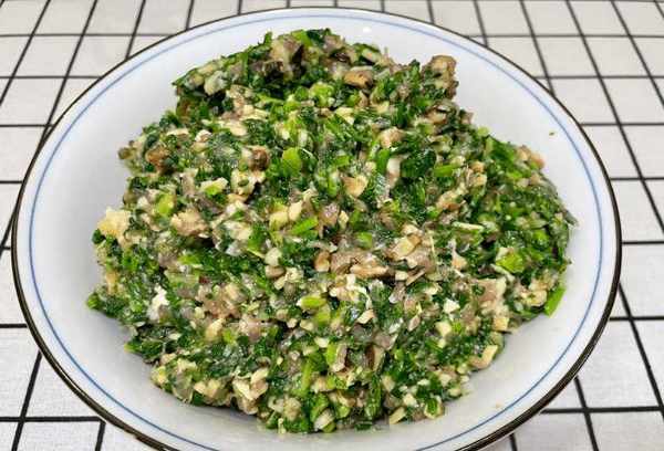 2、香菇、冬笋切末,锅内倒入油烧热,加入香菇炒香,倒入冬笋炒片刻,关火晾凉,倒入肉馅,加入荠菜碎,打一个鸡蛋,加入盐和生抽,蚝油,糖,食油拌匀。