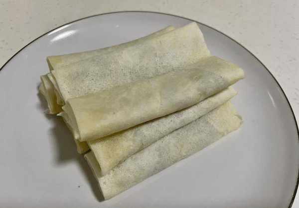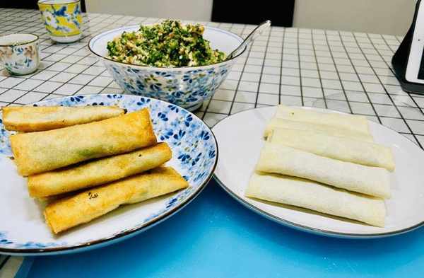 3、取春卷皮,舀一勺荠菜馅,从下往上卷到中间,然后将两边向中间对折,再卷起来,边缘沾点水。锅里放油烧热,放入春卷,煎至两面金黄。
