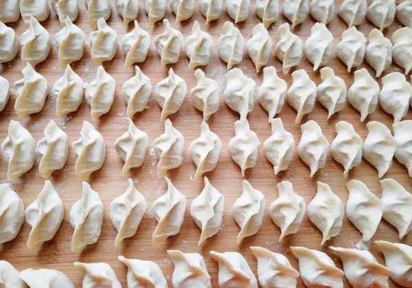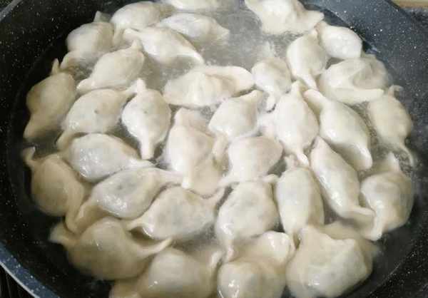 3、准备饺子皮,腌制荠菜馅,开始包饺子。在饺子皮中间放一勺馅,对折,用手捏住,饺子就成型了。包好后下锅烧开水,加入一勺盐,煮3分钟,等全部浮起来后捞出。