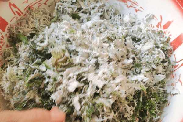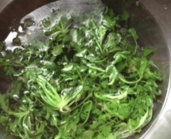 3、荠菜蒸熟后取出,趁热用筷子抖一抖,放凉,倒入蒜汁,搅拌均匀即可食用,清新爽口,特别好吃。