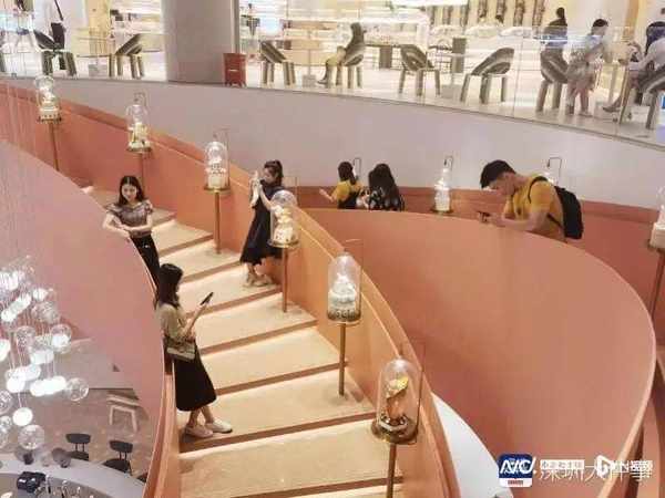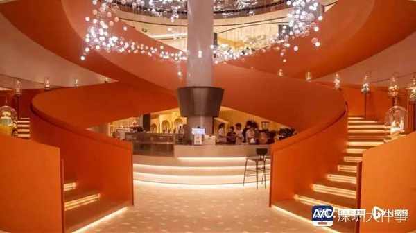 在海岸城,同样以超大试验型门店推出的,还有曾经的奈雪梦工厂。近6000平米的蛋糕主题空间,有蛋糕、咖啡、茶饮、鲜花、零售等众多业态,门店里以莫比乌斯环为原型的楼梯,也是网红们的常驻打卡地。昂司对外声称耗资一个亿打造。