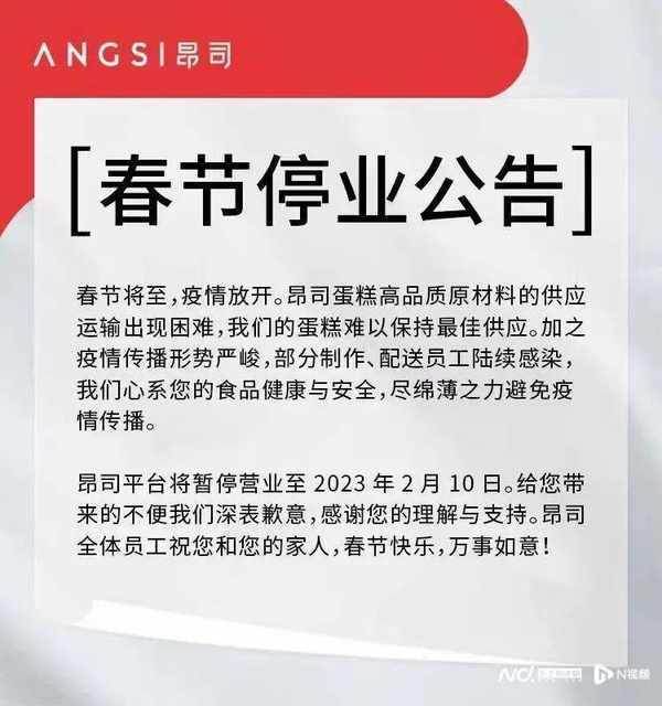 在昂司蛋糕门店员工小林的微信朋友圈,最新的一条更新停留在1月5日发布的“春节停业公告”。而在这个停业公告里,昂司平台对于门店暂停营业至2023年2月10日的解释为,受疫情影响原材料供应运输出现困难,以及部分制作、配送员工出现感染。而彼时,正值春节前夕,疫情管控放开。