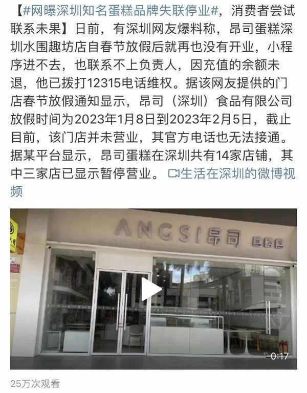 日前,有深圳网友爆料称, 昂司蛋糕深圳水围趣坊店自春节放假后就再也没有开业,小程序进不去,也联系不上负责人,因充值的余额未退,他已拨打12315电话维权。