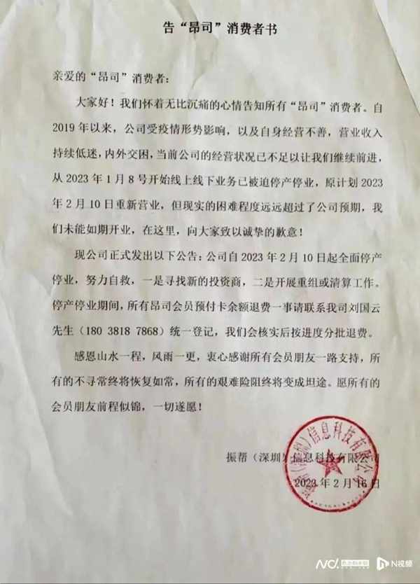 “自2019年以来,公司受疫情形势影响,以及自身经营不善,营业收入持续低迷。 从2023年1月8日开始,线上线下业务已被迫停产停业,原计划2023年2月10日重新营业,但现实的困难程度远远超过了公司预期,所以未能如期开业。在这里,向大家致以诚挚的歉意。”