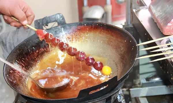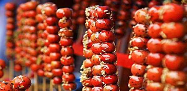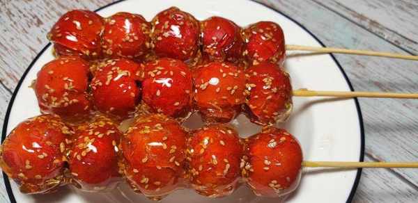 糖葫芦是中国的传统小吃。天津称“糖墩儿”,安徽称“糖秋儿”。它起源于南宋,距今已有800多年的历史。它是用竹竿将野果串起来制成的。用麦芽糖包裹,冷却后变硬,口感清脆。水果可以是草莓、葡萄、圣女果、山楂等。